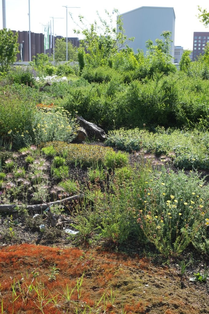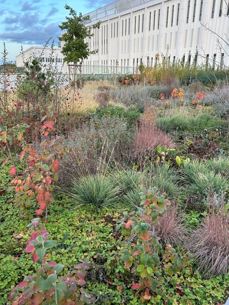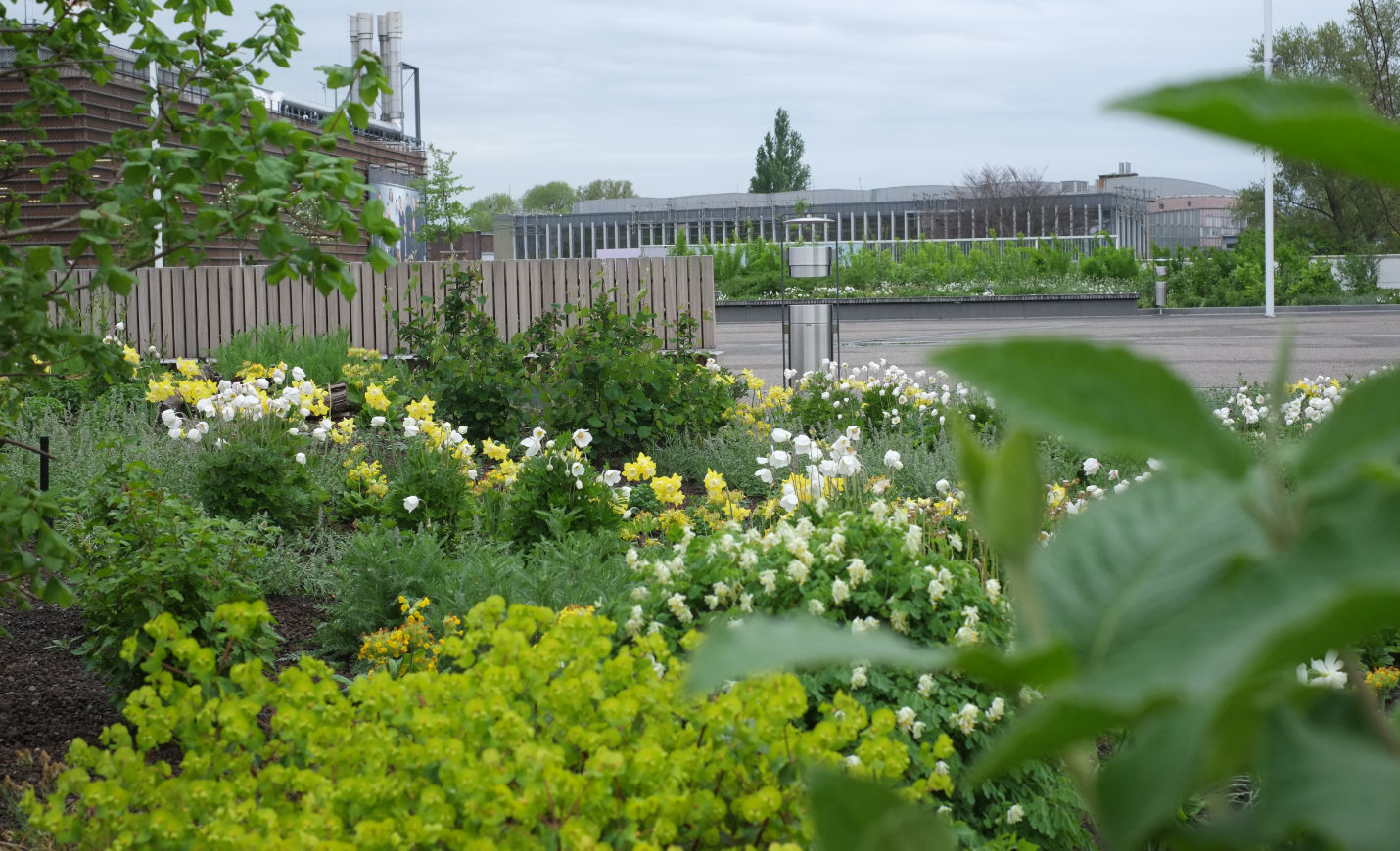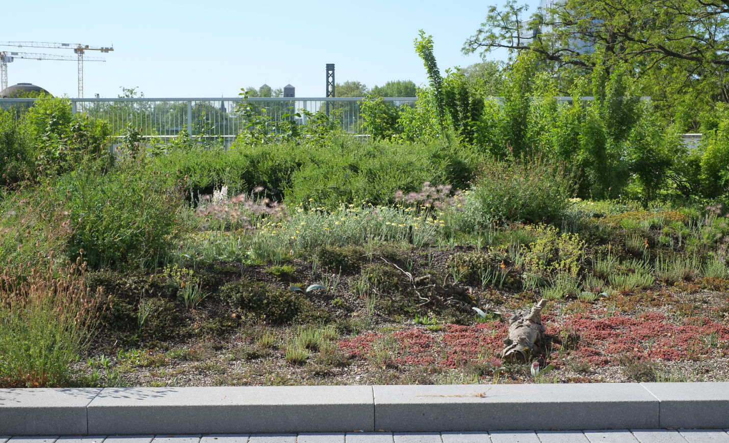 Um dieses Ziel zu erreichen, wird eine hohe Vielfalt an Stauden, Wildstauden und Gehölzen zusammengebracht, um ein dynamisches und naturnahes Habitat herzustellen, das Nahrung und Nistmöglichkeiten für Insekten und Vögel bieten kann. Grundsätzlich umfasst die Pflanzauswahl 68 verschiedene Arten trockenheits- und hitzetoleranter bzw. -liebender Pflanzen. Außerdem wird mit jungen Gehölzen gearbeitet, damit sich diese an den extremen Standort im Laufe der Jahre gut anpassen können. Eine automatische Bewässerung ist installiert, um die Pflanzen, vor allem die Gehölze, in der Anwuchsphase ideal zu versorgen. Im Laufe der Jahre soll die Bewässerung auf ein Minimum reduziert werden und nur in Trockenspitzen die Pflanzung unterstützen, um den fehlenden Kontakt zum Grundwasser und die exponierte Lage auszugleichen.