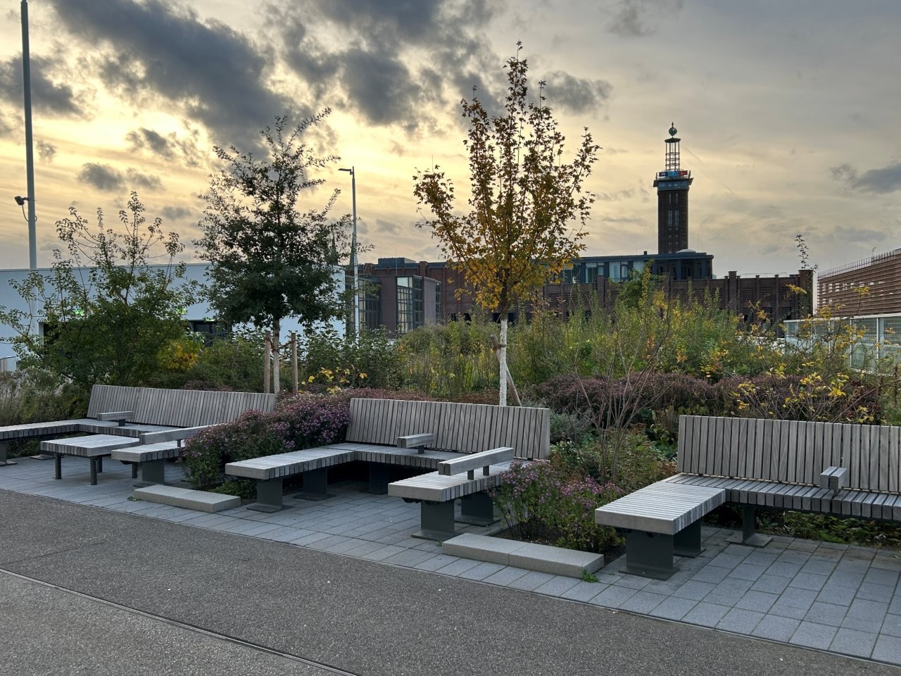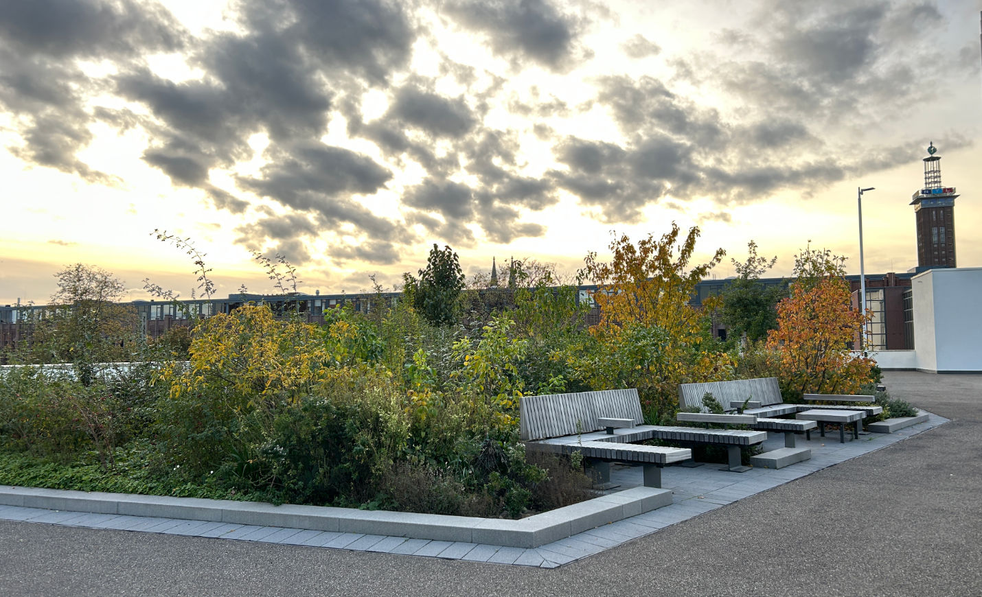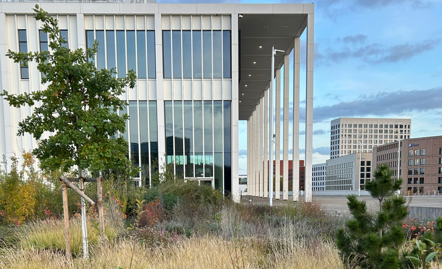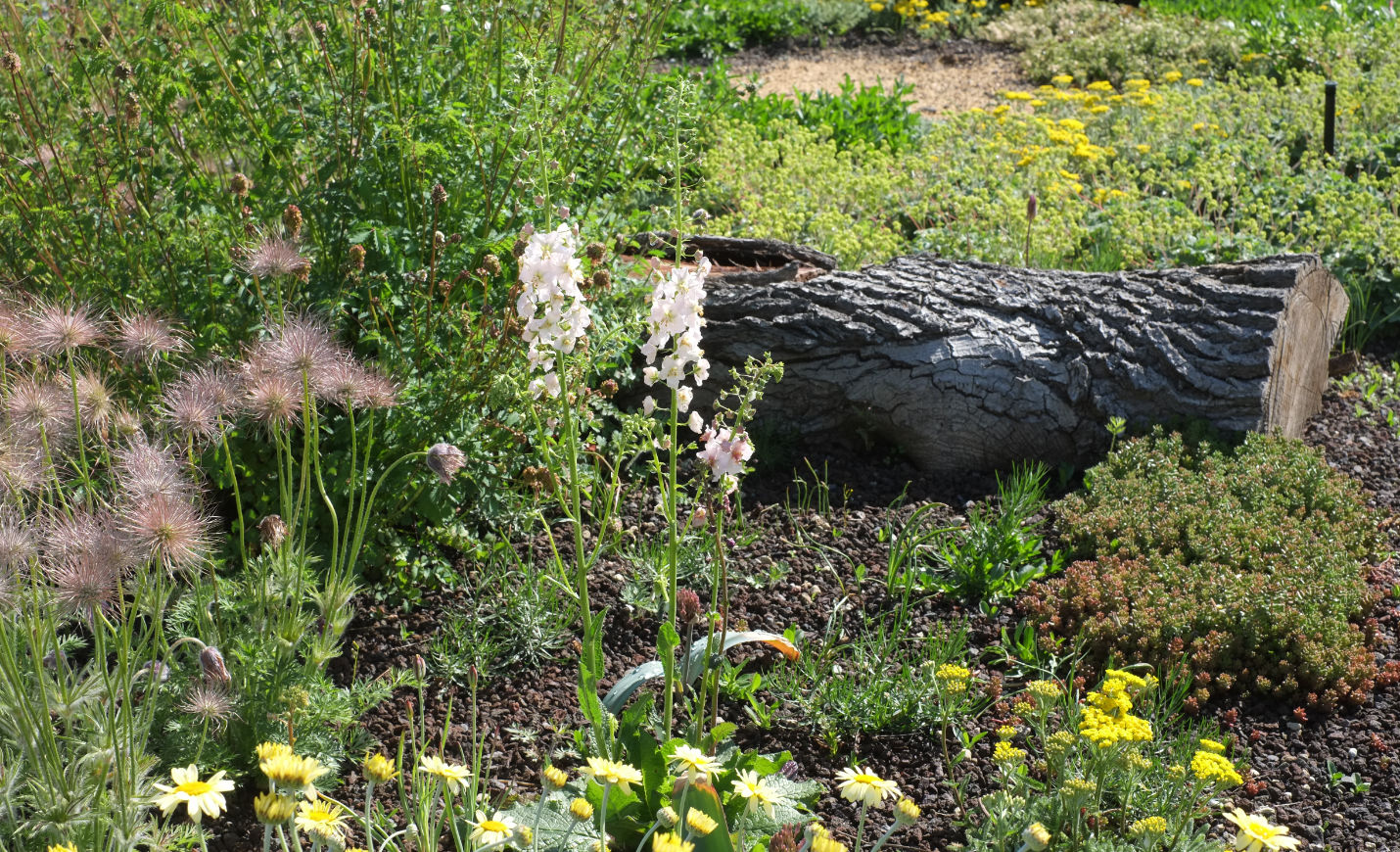 Um dieses Ziel zu erreichen, wird eine hohe Vielfalt an Stauden, Wildstauden und Gehölzen zusammengebracht, um ein dynamisches und naturnahes Habitat herzustellen, das Nahrung und Nistmöglichkeiten für Insekten und Vögel bieten kann. Grundsätzlich umfasst die Pflanzauswahl 68 verschiedene Arten trockenheits- und hitzetoleranter bzw. -liebender Pflanzen. Außerdem wird mit jungen Gehölzen gearbeitet, damit sich diese an den extremen Standort im Laufe der Jahre gut anpassen können. Eine automatische Bewässerung ist installiert, um die Pflanzen, vor allem die Gehölze, in der Anwuchsphase ideal zu versorgen. Im Laufe der Jahre soll die Bewässerung auf ein Minimum reduziert werden und nur in Trockenspitzen die Pflanzung unterstützen, um den fehlenden Kontakt zum Grundwasser und die exponierte Lage auszugleichen.