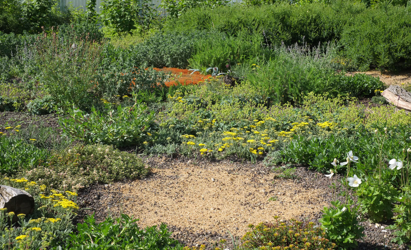 Zwei große Pflanzflächen mit darin integrierten Sitznischen laden Besuchende zu einer Pause inmitten von Sträuchern und Wildastern ein, während zwei lange Bänke zusätzliche Sitzmöglichkeiten mit weitem Blick neben Katzenminze, Wiesensalbei und Steinquendel im Nord- und Südbeet anbieten.