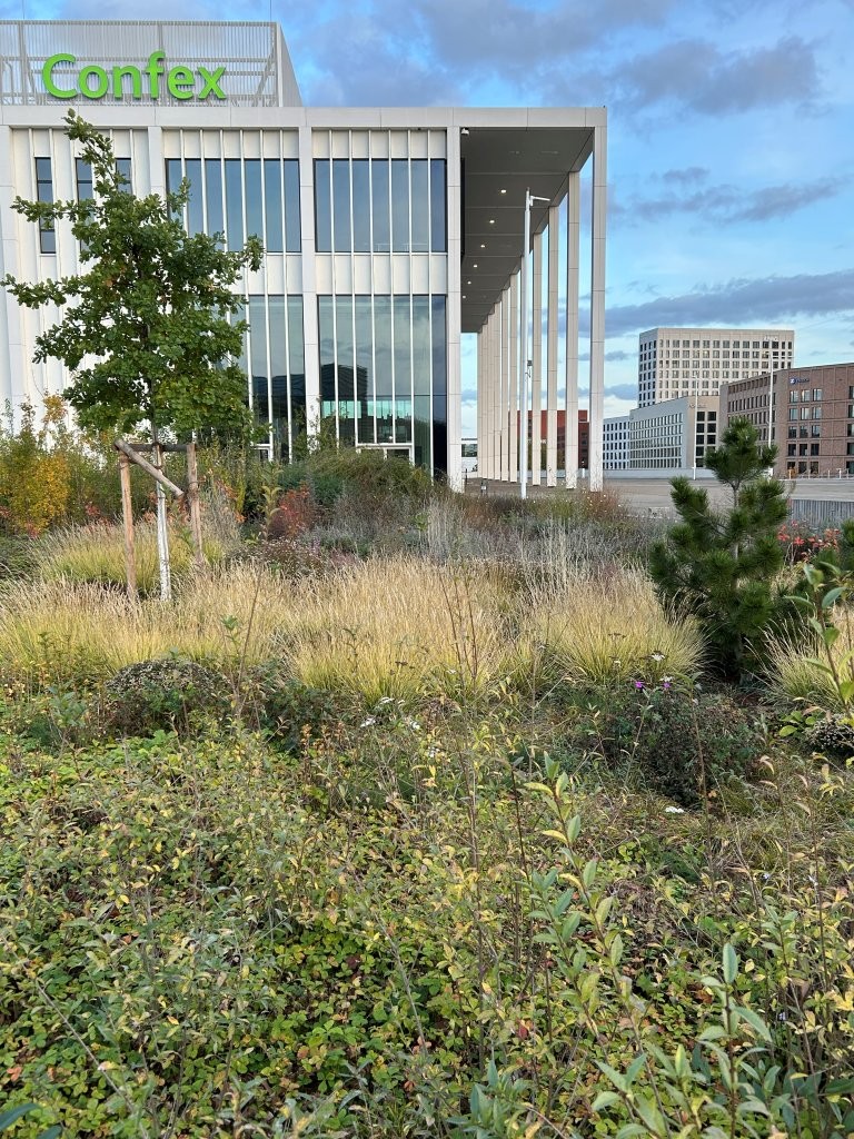 Die Bepflanzung (insgesamt ca. 1400m²) stellt aufgrund ihres Extremstandortes (eine Dachbegrünung mit i.T. sehr geringem Substrataufbau in ungeschützter, vollsonniger und windanfälliger Lage) eine sehr spannende Herausforderung dar. Diese begreifen wir als Chance eine komplexe Landschaft zu schaffen, welche die vorhandenen Bedingungen annimmt und für sich nutzt, und so zu einer resilienten Gemeinschaft zusammenwächst.